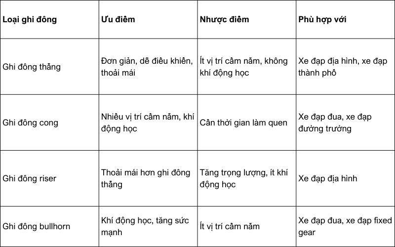 - Ảnh hưởng đến tư thế người lái: Hình dáng và kích thước ghi đông quyết định tư thế của bạn sẽ thẳng lưng, thoải mái (như xe đạp thành phố) hay cúi thấp, khí động học (như xe đạp đua).