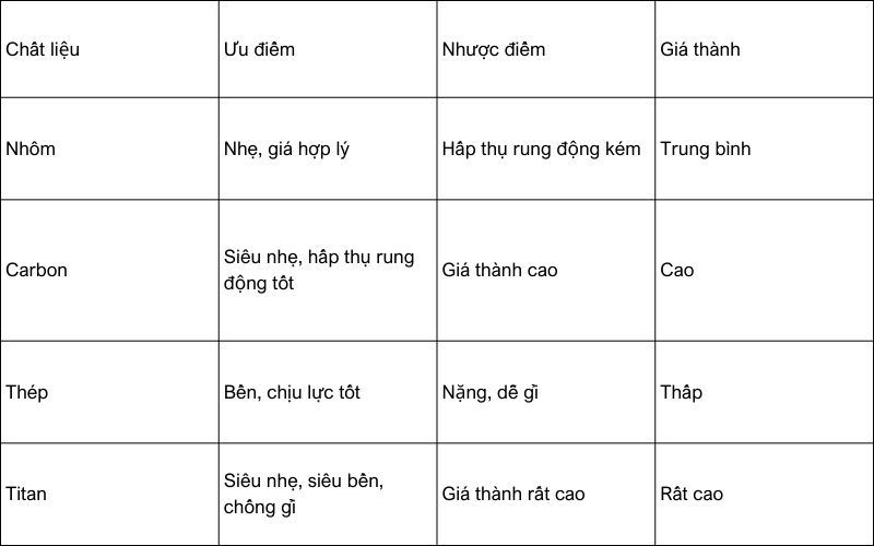 Ghi đông xe đạp không chỉ đa dạng về kiểu dáng mà còn phong phú về chất liệu. Mỗi loại vật liệu đều mang đến những đặc tính riêng biệt, ảnh hưởng đến trọng lượng, độ bền, khả năng hấp thụ rung động và giá thành của chiếc xe.